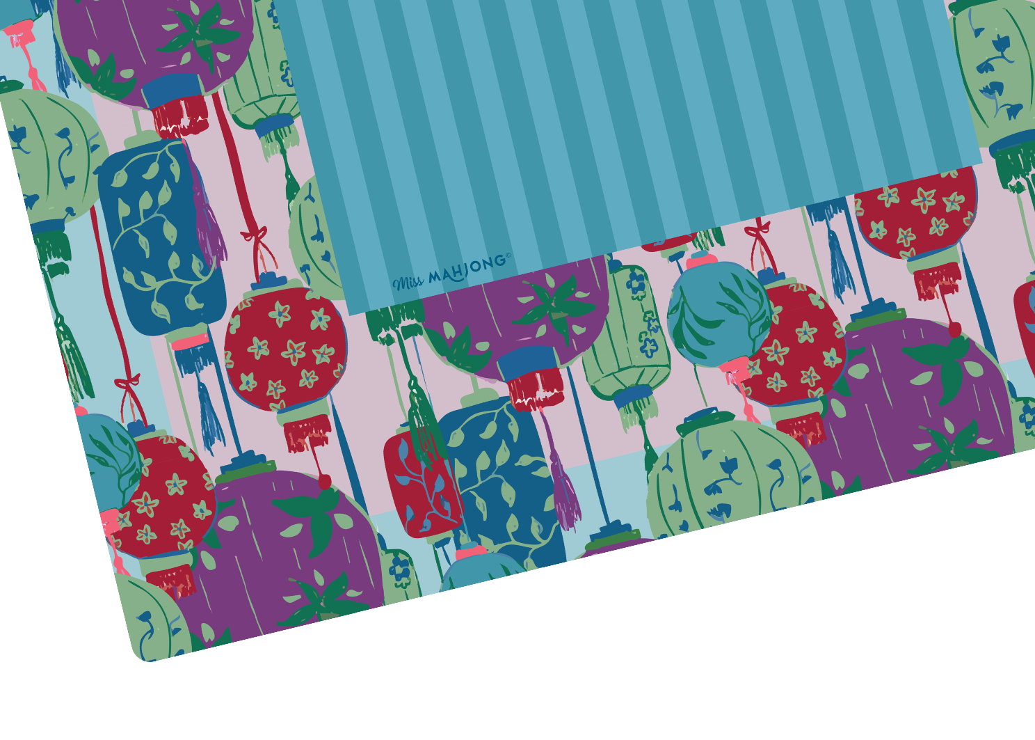 The Festival Mat is a bold, celebratory pairing for nearly any mahjong tile set, featuring a tonal green stripe through the center and a lively hand-drawn lantern print around the border.